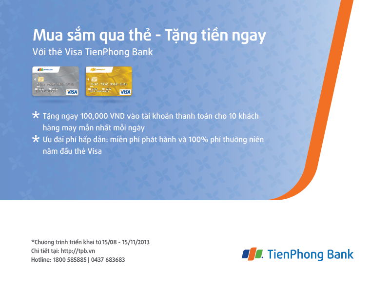 From 8/2013 to 15/11/2013, TPBank's Visa card holders will have a chance to receive many cash prizes everyday when using payment cards to buy goods and services.
