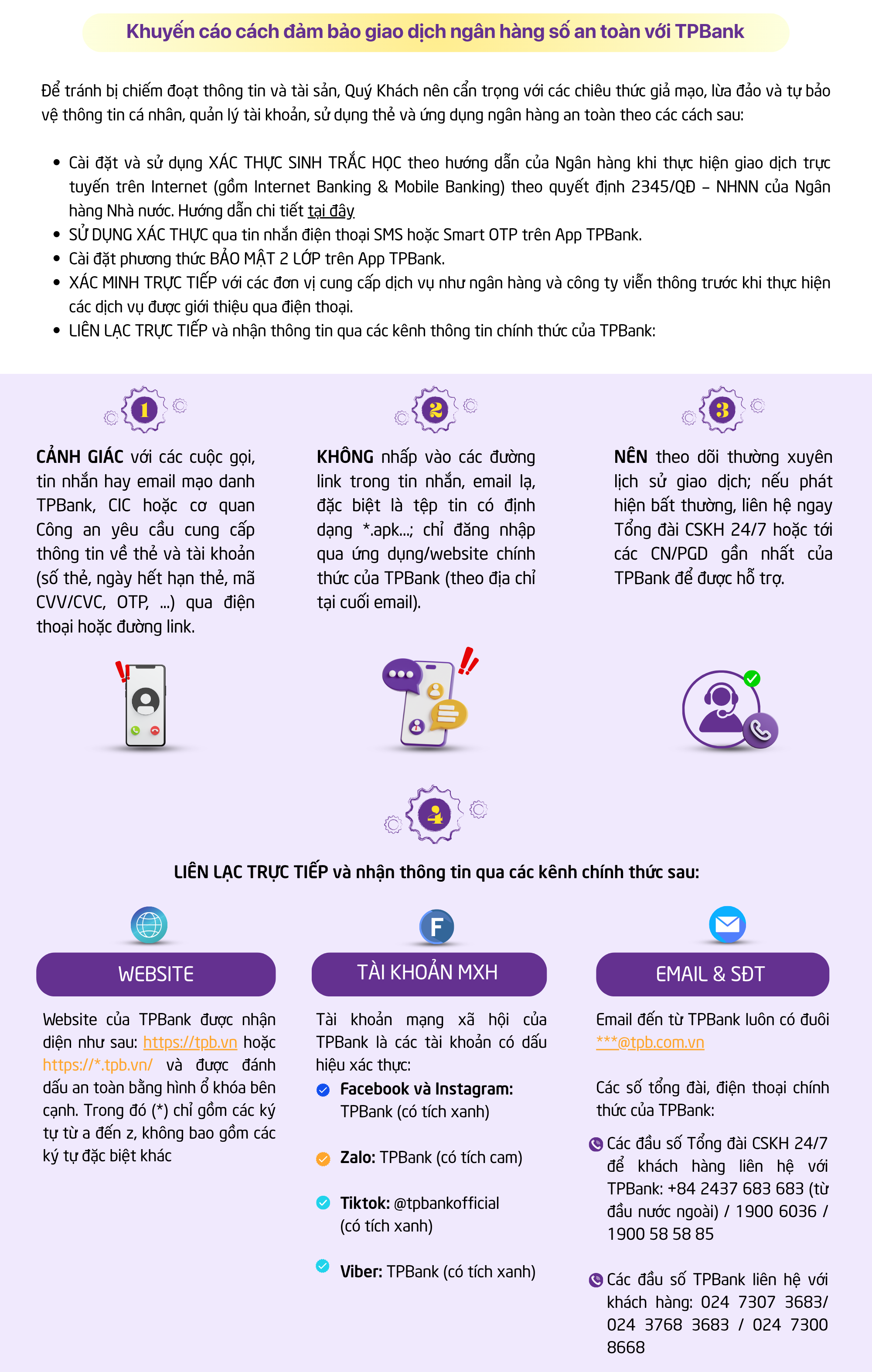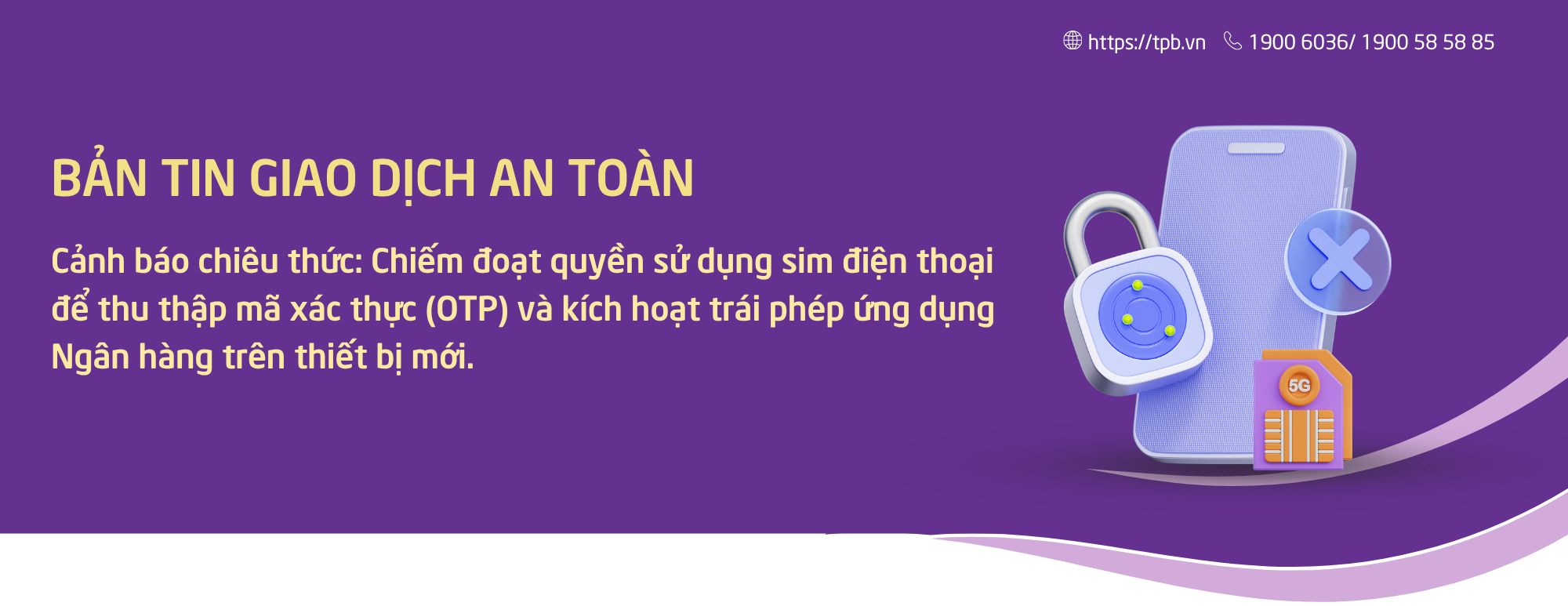 Để đảm bảo an toàn thông tin và tài sản, TPBank khuyến cáo Quý khách nâng cao cảnh giác và cẩn trọng với hình thức chiếm đoạt tài sản qua SIM điện thoại từ đó thu thập mã xác thực (OTP) và kích hoạt trái phép ứng dụng Ngân hàng trên thiết bị điện thoại mới. Cụ thể như sau: