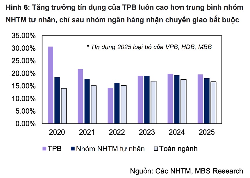 MBS dự báo tín dụng của TPBank có thể tăng khoảng 13,6% trong năm 2026 và 12,9% trong năm 2027 nhờ kỳ vọng tín dụng doanh nghiệp tiếp tục tăng trưởng tốt khi mặt bằng lãi suất vẫn ở mức hấp dẫn, trong khi cho vay bán lẻ được kỳ vọng tiếp tục hồi phục.