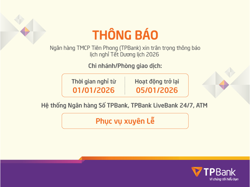 TPBank xin thông báo lịch hoạt động trong dịp Tết Dương lịch 2026 như sau: