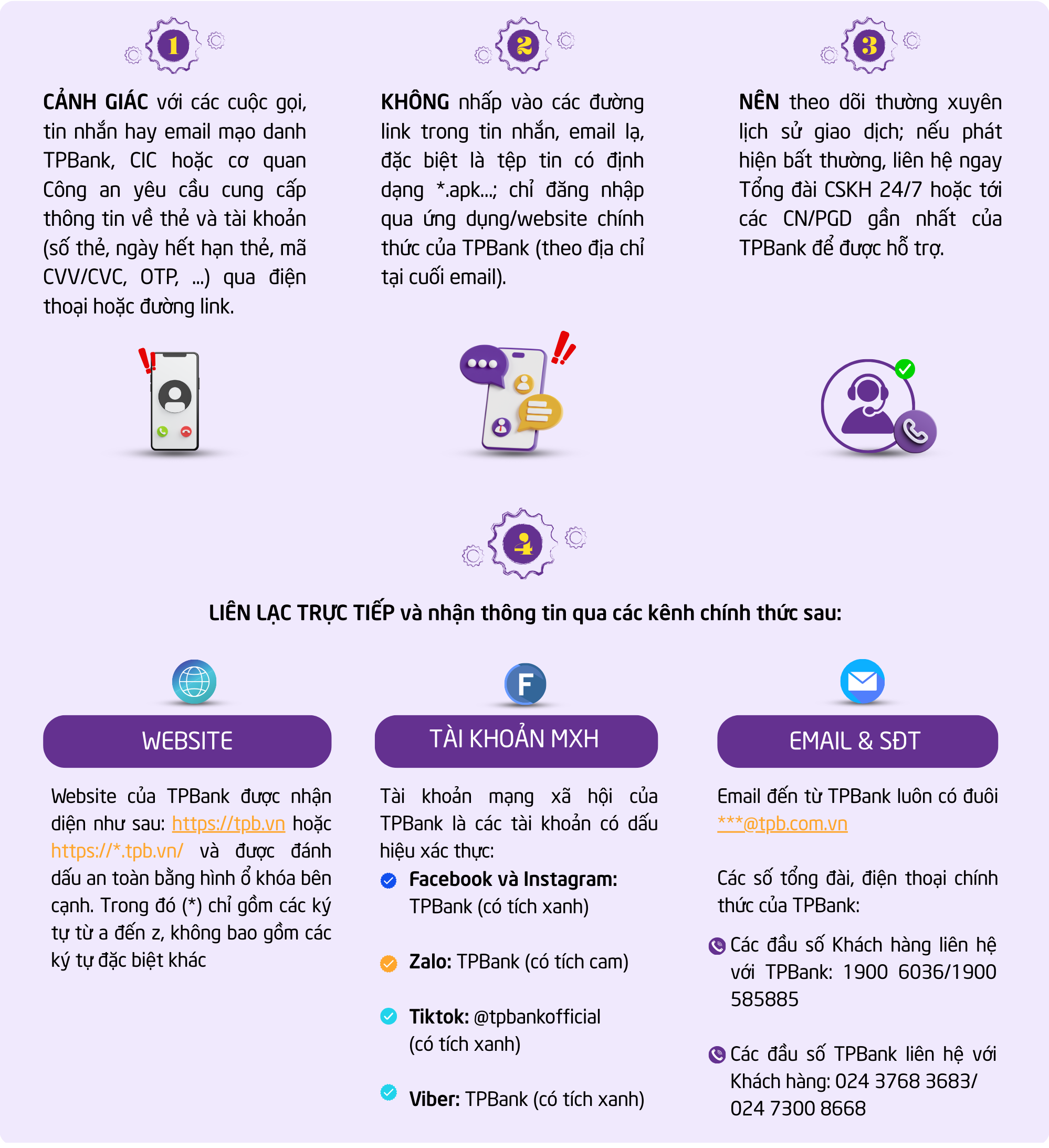 TPBank cũng thường xuyên khuyến cáo khách hàng nâng cao cảnh giác với các thủ đoạn lừa đảo để bảo vệ quyền và lợi ích của mình, cũng như để tránh bị kẻ xấu lợi dụng thực hiện các hành vi phát tán mã độc, lừa đảo, chiếm đoạt tài sản.